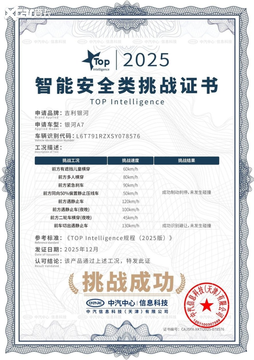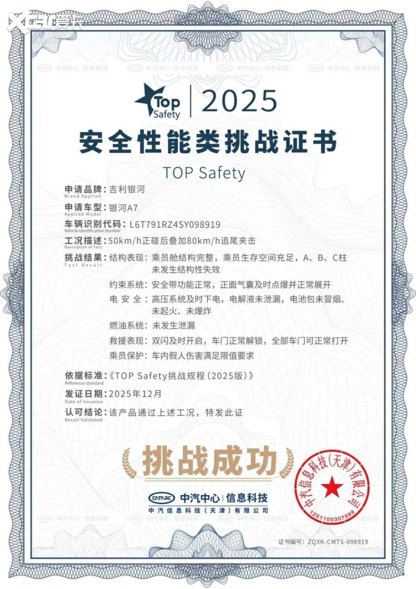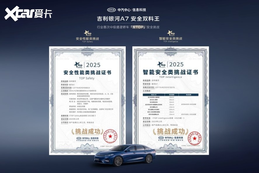 12月25日,吉利银河A7成功通过中汽中心行业首次中型插混轿车「双TOP」顶级安全挑战,成为行业唯一同时获颁安全性能类挑战证书和智能安全类挑战证书的的车型。安全家轿认准银河A7!凭借吉利汽车全域安全体系的最坚实底座,吉利银河成为了全球最快达成年销百万辆的新能源汽车品牌,作为银河品牌主打车型之一,吉利银河A7完整继承了吉利的安全基因,凭借7大核心安全实力,成功通过中汽中心安全大考,再次证明其作为十万级混动家轿安全新标杆的颠覆性实力。